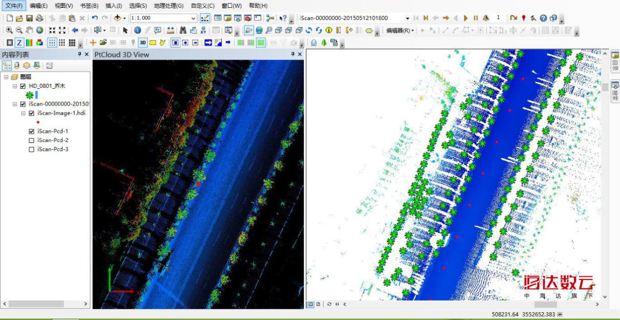 本項目使用三維激光移動測量系統(tǒng),對園林樹木信息進行外業(yè)采集,內(nèi)業(yè)基于點云自動化提取行道樹,結(jié)合手工進行檢查修改,減輕了傳統(tǒng)測量外業(yè)采集工作量,提高了工作效率。通過試驗區(qū)采集處理對比驗證,可以大幅度提高生產(chǎn)效率,為城市專題圖數(shù)據(jù)生產(chǎn)更新,提供更便捷有效的解決方案。